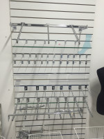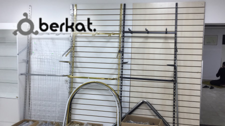 Размеры: высота 2400 мм, ширина 1200мм, толщина 18 мм. Количество пазов - 23. Также к ним имеются кронштейны, крючки, полки и другие аксессуары.