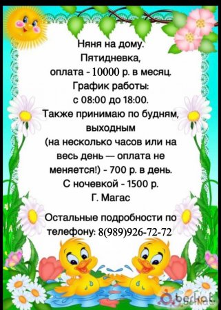 Няня на дому. Пятидневка, оплата - 10000 р. в месяц График работы: с 08:00 до 18:00. Также принимаю по будням, выходным (на несколько часов или на весь день — оплата не меняется!) - 700 р. в день. С ночевкой - 1500 р. Г. Магас. Остальные подробности по телефону: 8(989)926-72-72