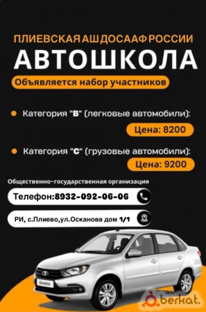 В Плиевскую автошколу ДОСААФ идет набор учеников на категорию (В/С)-(В)легковая машина,(С)грузовая машина, все вопросы по телефону (89320920606)