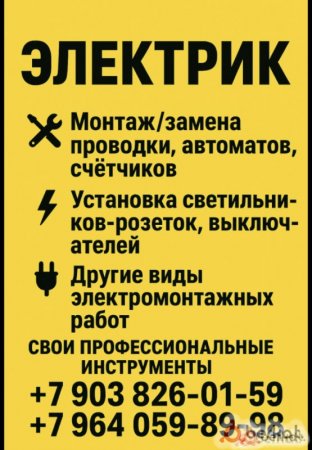 Электрик — любые сложности! ⚡ ✅ Свои профессиональные инструменты ✅ Гарантия на выполненные работы ✅ Честные цены, без накруток ✅ Ответственный и аккуратный подход Что делаю: ✅ Замена и ремонт проводки (квартиры, дома, офисы) ✅ Установка розеток, выключателей, светильников ✅ Быстро найду и устраню любые неполадки (нет света, выбивает автомат, греется проводка) ✅ Сборка и подключение электрощитов «под ключ»