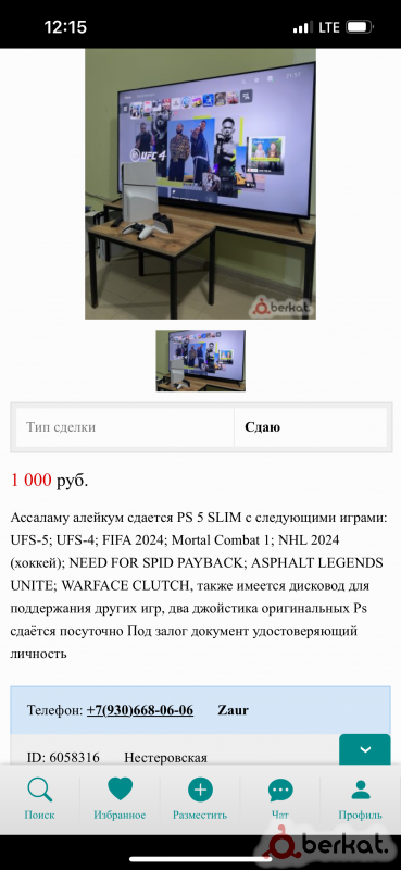 Ассаламу алейкум сдается PS 5 SLIM с следующими играми: UFS-5; UFS-4; FIFA 2024; Mortal Combat 1; NHL 2024 (хоккей); NEED FOR SPID PAYBACK; ASPHALT LEGENDS UNITE; WARFACE CLUTCH, также имеется дисковод для поддержания других игр, два джойстика оригинальных Ps сдаётся посуточно Под залог документ удостоверяющий личность