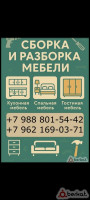 Услуги: — Сборка новой мебели ( кухни, шкафы, столы и др.). — Ремонт: замена фурнитуры, петель, ручек; укрепление конструкций, починка ящиков/дверей. ? Преимущества: • Работаю быстро и аккуратно. • Гарантия на все виды работ. • Доступные цены (договорные, прайс по запросу). ? Примеры работ и отзывы — предоставлю по запросу! ? Звоните/пишите: Телефон: +7(988)1297778 +7 988 801-54-42 WhatsApp:+7(962)1690371 ? Работаем без выходных! Сроки: • Сборка — от 2 часов (в зависимости от сложности). • Ремонт — в течение дня