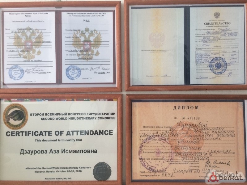 Высококвалифицированный специалист с медицинским стажем 40 лет оказывает услуги: Гирудотерапия/лечение пиявками (в том числе - бесплодия), продажа пиявок. Хиджама, а также капельницы, внутривенные и внутримышечные инъекции и массаж: лечебный массаж, детский, спортивный, антицеллюлитный, корректирующий и т.д. Возможен выезд на дом. Медицинское образование, огромный стаж, повышение квалификации, специализации по гирудотерапии (пиявки), хиджаме и массажу, все это подтверждено дипломами, сертификатами, свидетельствами, грамотами, трудовой книжкой, которые вы можете увидеть в чистом и уютном кабинете, находящемся по улице Осканова, рядом со Сбербанком и Гимназией г. Назрань. В ватсапе не всегда