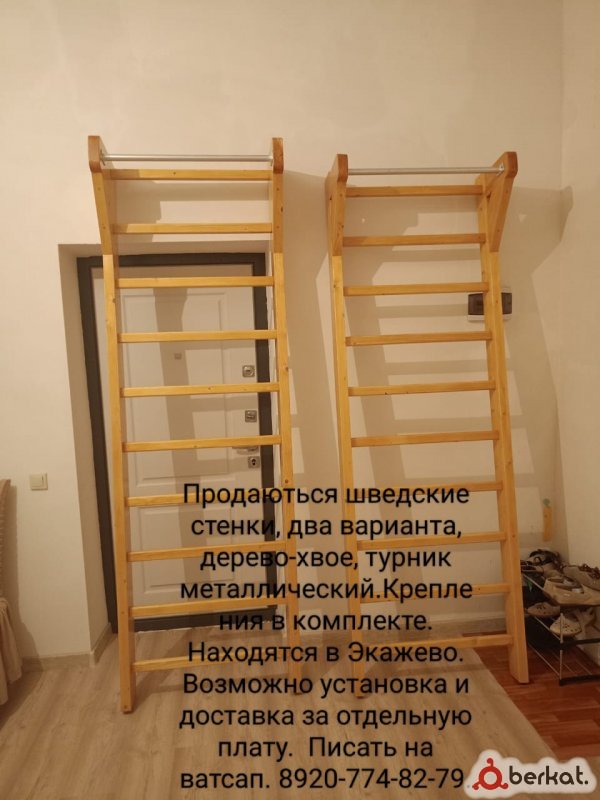 Шведская стенка деревянная, турник металлический. Ширина по наружи 78см высота до турнира 2м35см. Крепления в комплекте . Находится в Экажево. Писать на вотсап по номеру 89207748279