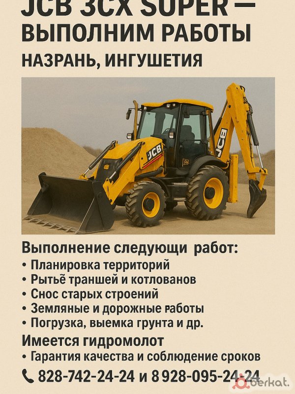 Ассалам алейкум предлагаю услуги колесного эксковатора-пагрузчика JCB . рытьё траншеи, котлована, ямы под кольца , загрузка сыпучих материалов , снос старых домов , планировка, а так же осуществляем доставку всех видов сыпучих материалов, песок, шебень, балласт, чернозем и многое другое, есть свои самосвалы и другая техника, звоните по цене договоримся!
